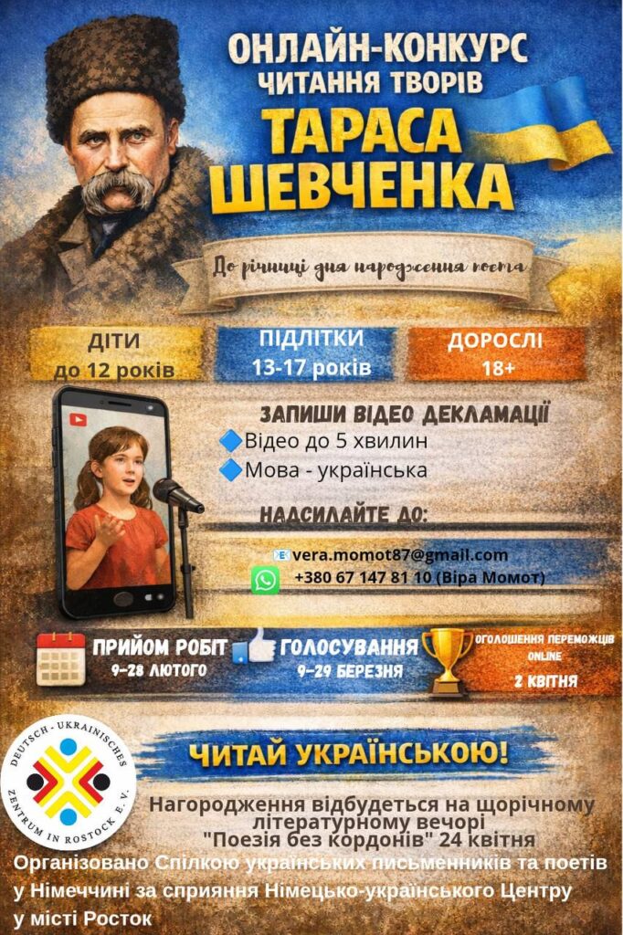 Wir laden herzlich alle Interessierten ein, am Online-Wettbewerb zur Rezitation von Werken Taras Schewtschenkos teilzunehmen. Ziel des Wettbewerbs ist die Förderung der ukrainischen Sprache und Literatur sowie die Würdigung des schöpferischen Erbes des Kobzar.
